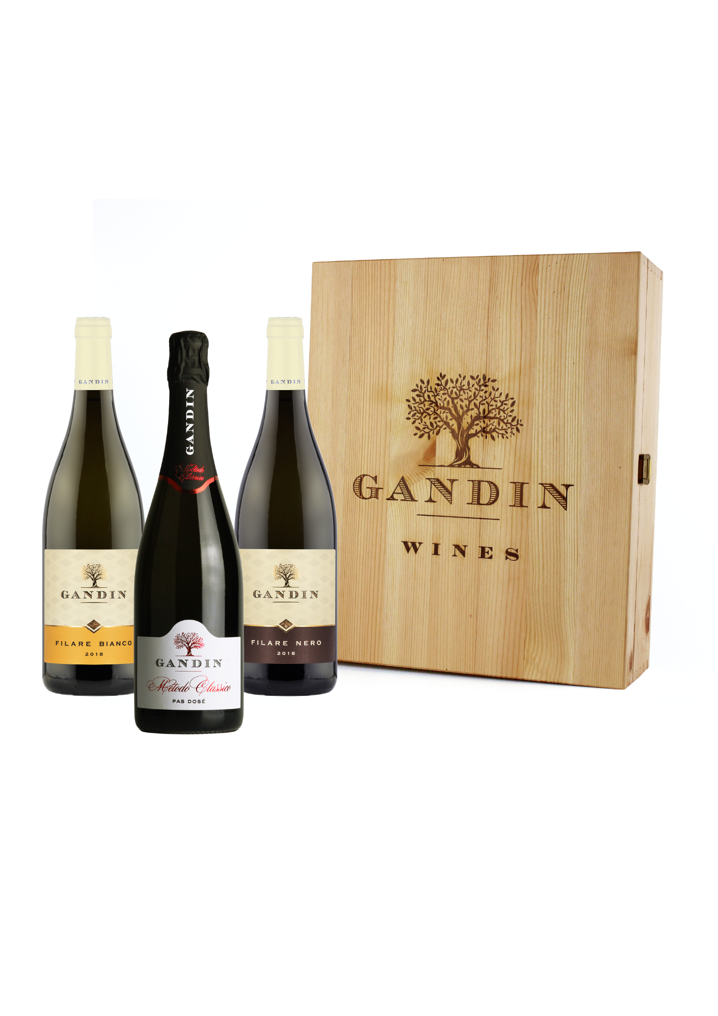 Cassetta in legno firmata Gandin Wines con varie combinazioni di tre bottiglie di vini DOC.